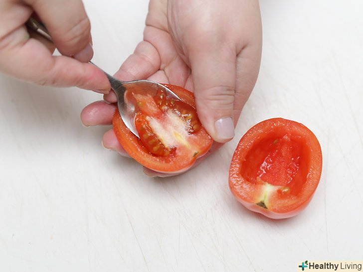 Видаліть насіння помідора.обережно розріжте помідор навпіл рівно посередині, щоб стебло залишився на одній частині, а дно — на інший. Після цього вийміть насіння помідора чайною ложечкою і викиньте їх. Постарайтеся при цьому не проникати занадто глибоко в м'якоть помідора.[3]- Насіння містять в собі бПро льшую частина кислоти помідора, ось чому їх видалення є відмінним способом зменшити кислотність.