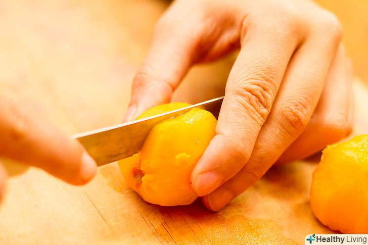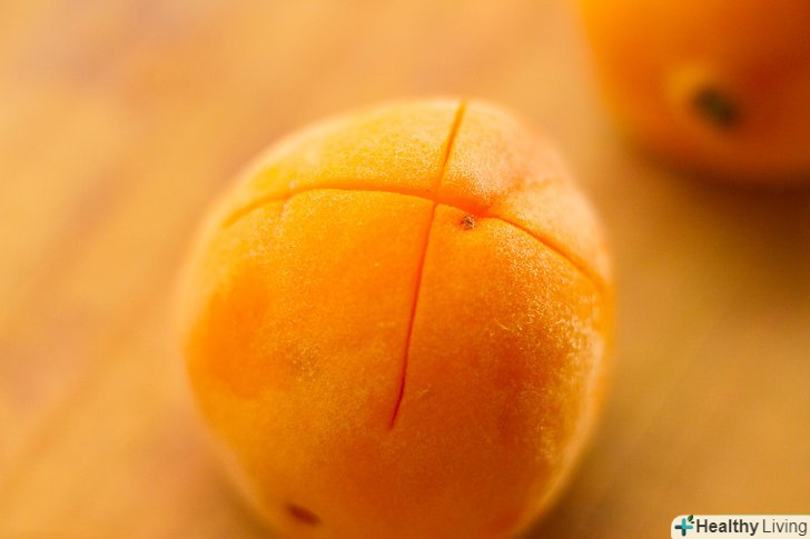 Зробіть гострим ножем розріз буквою " х " в нижній частині кожного персика.дві перетинаючі лінії, які проходять глибоко в персик, дозволять розширитися йому в процесі бланшування. Також, вони дозволять легше очистити персики від шкірки.