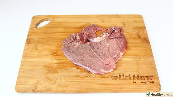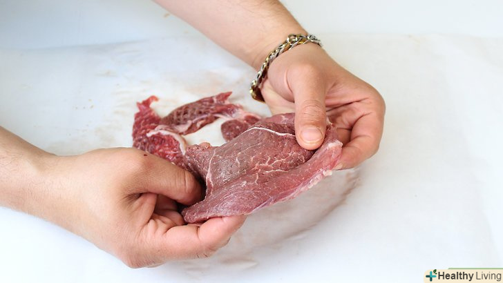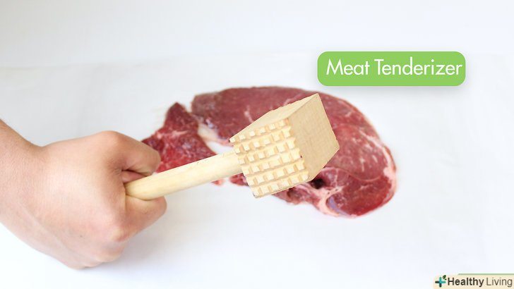 Виберіть інструмент для розм'якшення м'яса.є два варіанти, які краще підійдуть при механічному розм'якшенні. Або ви можете використовувати справжній молоток для відбивання м'яса (який виглядає як середньовічне знаряддя для тортур) або ніж. Вибір за вами.- Розм'якшіть м'ясо.Розм'якшення м'яса по суті означає, що ви, попередньо жуючи м'ясо інструментом, робите його тонше і ніжніше.