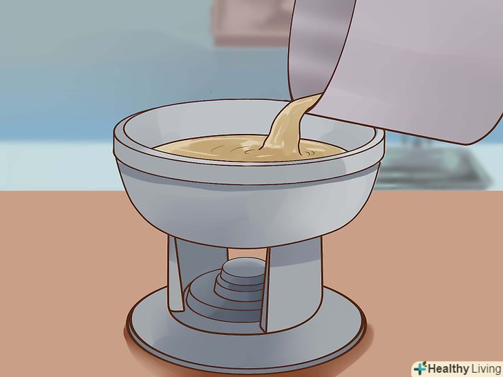 Перелийте розігріту рідину в ємність для фондю.наповніть каструлю на 1/3 -1 / 2. Будьте обережні, щоб не обпектися гарячою рідиною.