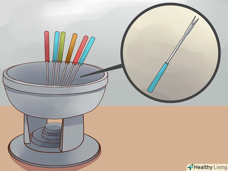 Переконайтеся, що у вас досить багато вилок для фондю, так щоб усім вистачило приладів.Вилки для фондю довгі, мають по 2 зубчики і, як правило, вони з різнокольоровими відмітками, щоб обідають за столом гості не плутали прилади.- Підготуйте харчові бамбукові шпажки, якщо у вас немає вилок для фондю. Ви повинні замочити бамбукові шпажки у воді за 30 хвилин до використання, щоб зменшити ймовірність загоряння.