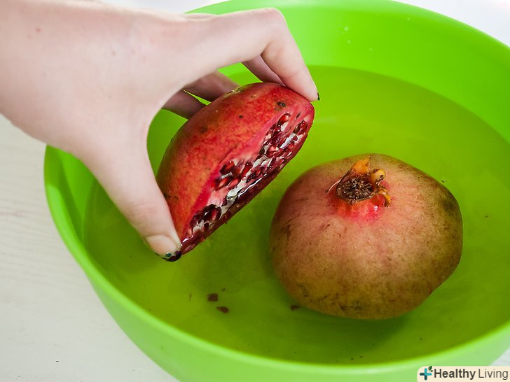 Візьми велику миску і наповни її водою.якщо у тебе дві половинки, поклади їх надрізом вниз у воду. Якщо фрукт тільки надрізаний, розломи його (на дві частини), поки фрукт занурений під воду, теж повернувши його шкіркою вгору. Це допоможе тобі не забризкати все соком.