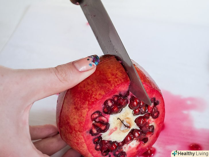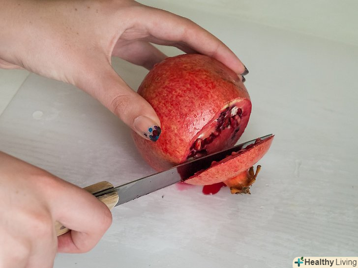 Розріж гранат навпіл, зверху вниз.не потрібно відрізати чашечку або будь – яку іншу частину граната-тільки навпіл. Якщо боїшся забруднити все соком, надріж його в місці середньої перегородки.