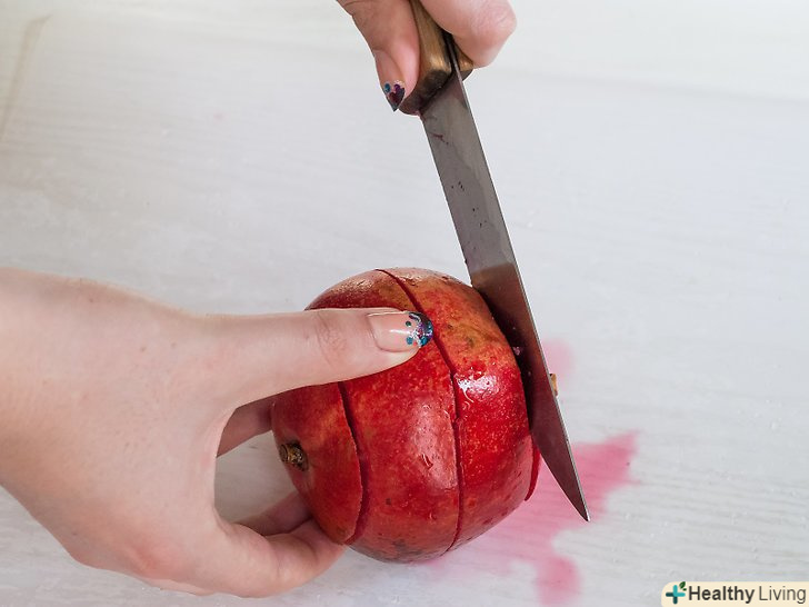 Зріж шкіру з граней граната.ці грані-перегородки між внутрішніми секторами граната - ти помітиш, що вони випирають на поверхні фрукта. Постарайся не зачепити зернятка. Тобі потрібно тільки зробити глибокі порізи, так що ріж до тих пір, поки не побачиш білу частину.- Один вид перегородок виходить від чашечки (верхівка або місце, звідки з'являється квітка), а другий – від кінця стебла. Ці два види розділені виступами, які оперізують гранат на дві третини від чашечки.