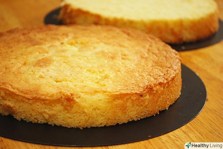 Коли нитка повністю обгорнута навколо торта, перехрестіть її кінці, і тримайте один кінець в правій руці, а інший - в лівій.потягніть кінці нитки на себе, так, щоб стягується нитка проходила крізь торт, розрізаючи його. Обережно тягніть то один, то інший кінець нитки, акуратно розділяючи коржі.