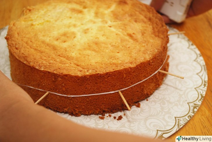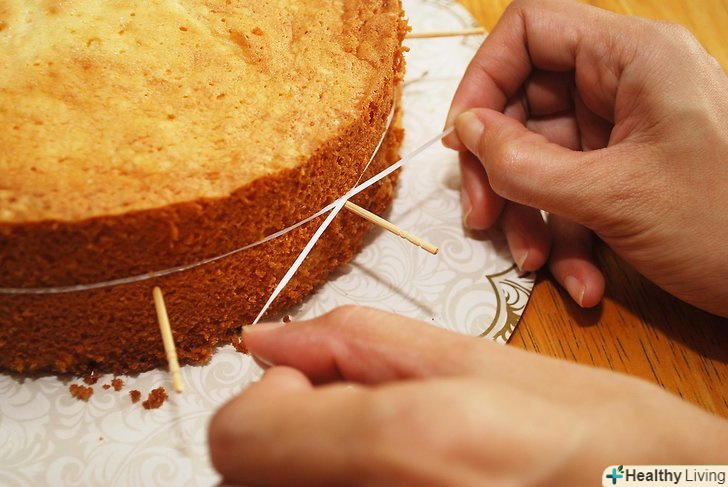 Розташуйте неароматизовану зубну нитку по отриманому ряду зубочисток.якщо ви розрізаєте бісквіт, можна зробити ножем кілька надрізів уздовж ряду зубочисток, це допоможе нитки легше розрізати поверхню коржа.