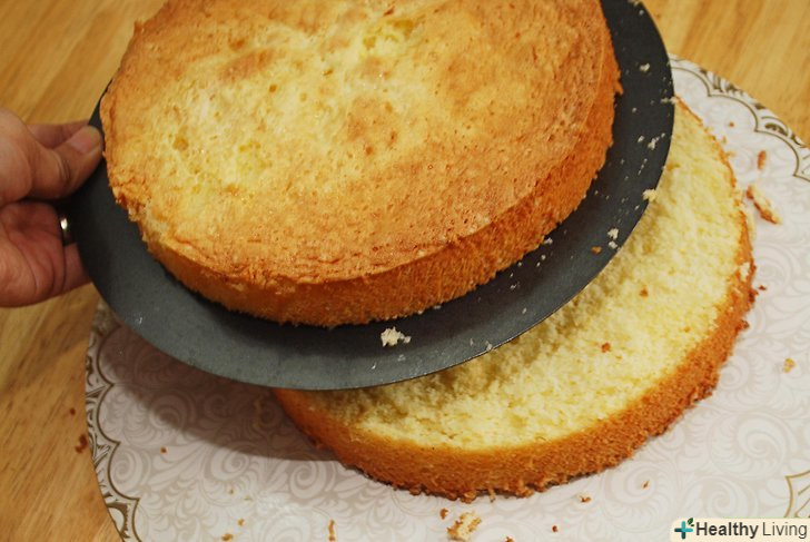 Обережно вставте в отриману проріз картон або лист для випічки (без бортиків), і зніміть верхній корж.