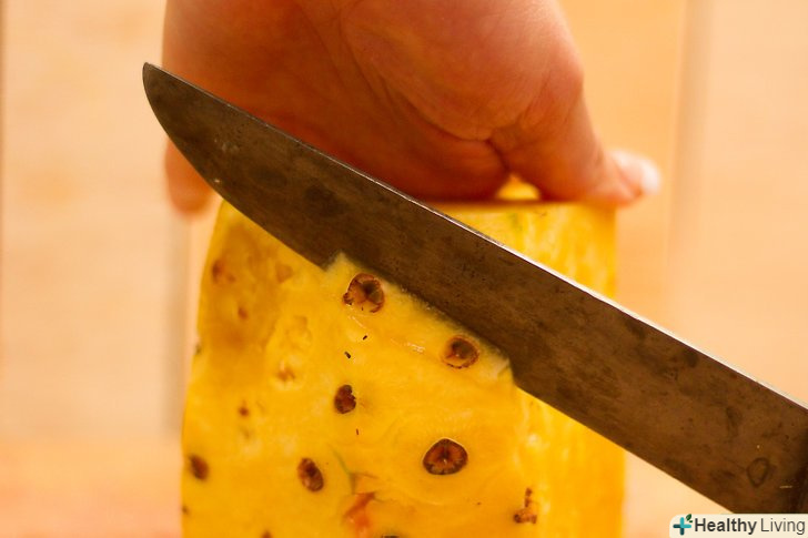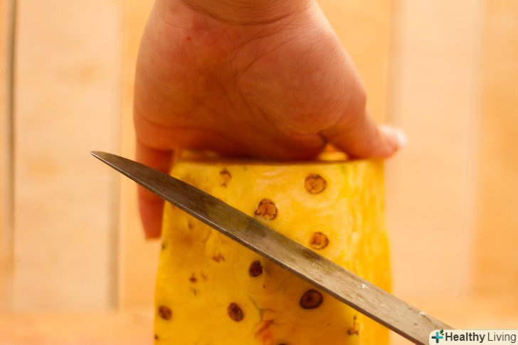 Поверніть ананас за годинниковою стрілкою на 5-10 см. і повторіть. Поверніть, відріжте і повторюйте, поки не буде видалена вся шкірка і тільки очі залишаться.