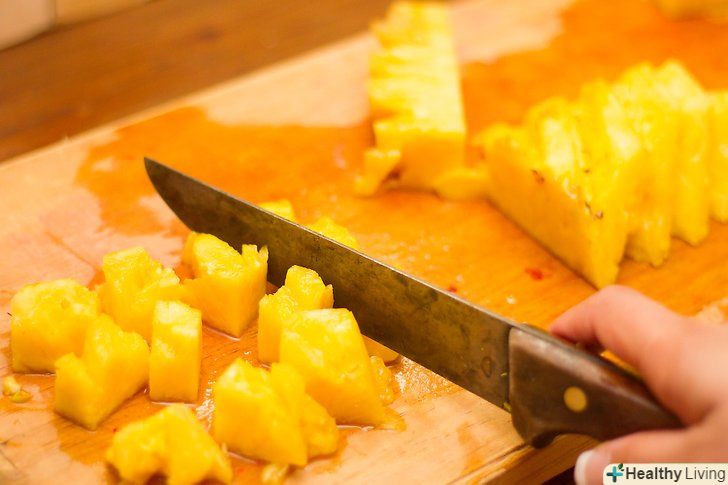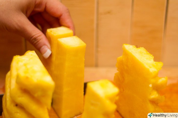 Розріжте ананас на чверті вертикально.виріжте центральну серцевину ананаса вертикальним зрізом. Вона тверда і не дуже солодка.- Наріжте залишився ананас як бажаєте.