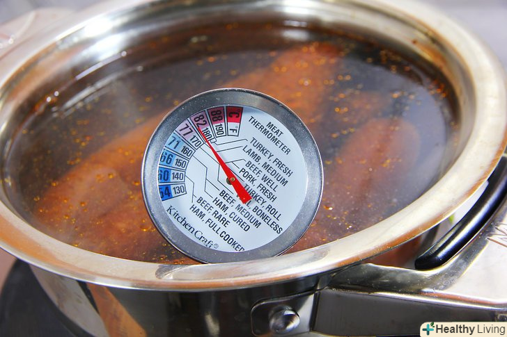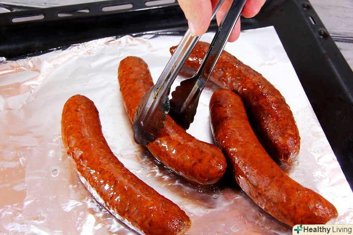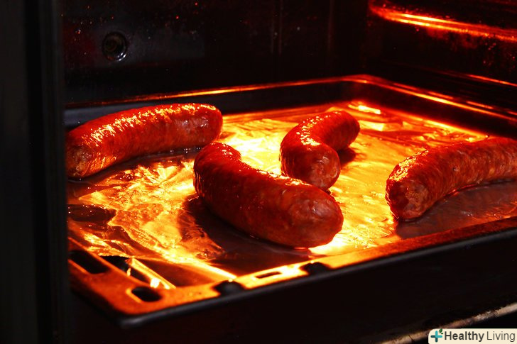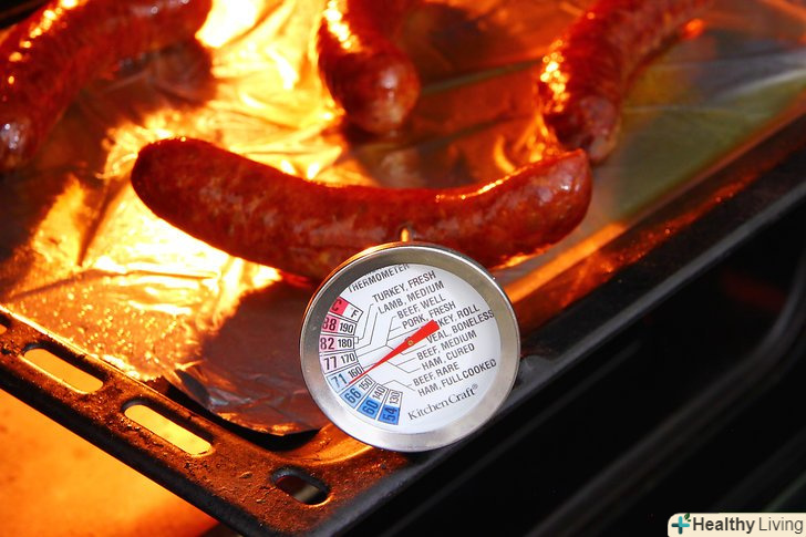 Виміряйте температуру внутрішньої частини сосисок за допомогою термометра для м'яса.температура внутрішньої частини готової сосиски повинна становити приблизно 70 °С. надріжте сосиску і подивіться, чи достатньо вона пропеклася. Переконайтеся, що всередині не залишилося рожевого м'яса, а м'ясний сік прозорий.[5]- Якщо вам здається, що м'ясо не дійшло до кондиції, покладіть деко назад в духовку на 5 хвилин, після чого знову перевірте ступінь готовності сосисок.[6].