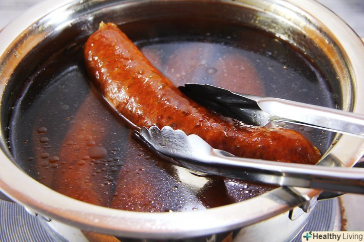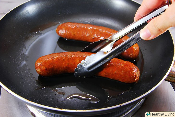 Викладіть сосиски на сковороду з киплячим маслом.сосиски не потрібно обсмажувати довго, так як вони вже були попередньо зварені.[17] як тільки сосиски покриються золотистою скоринкою, вимкніть плиту, щоб вони не висохли і не підгоріли.[18]- Можна викладати на сковороду цілі сосиски, а можна розрізати їх навпіл (як уздовж, так і поперек) або на кілька шматочків.[19]