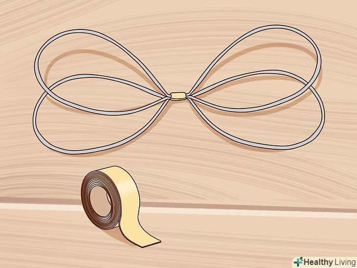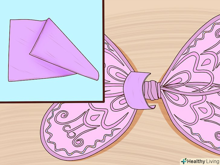 Пов'яжіть навколо центру зі скотчем дві довгі стрічки.відріжте дві довгі стрічки, які добре поєднуються за кольором і візерунком З крилами. Поверніть стрічку навпіл і пропустіть її під центром зі скотчем, так щоб петля стрічки виступала з-під крил на 2-3 сантиметри. Протягніть обидва вільних кінця стрічки в петлю і потягніть за них, щоб затягнути вузол. Пересуньте стрічку до лівого крила.- Виконайте те ж саме з другою стрічкою, але на цей раз перемістіть її до правого крила.