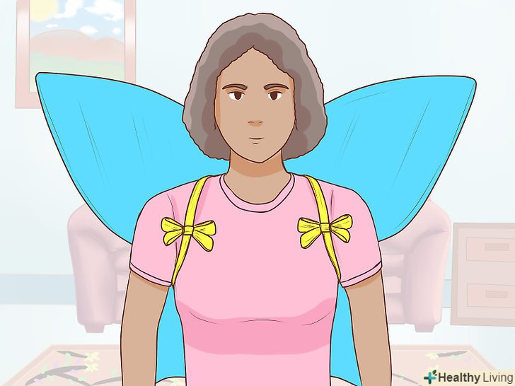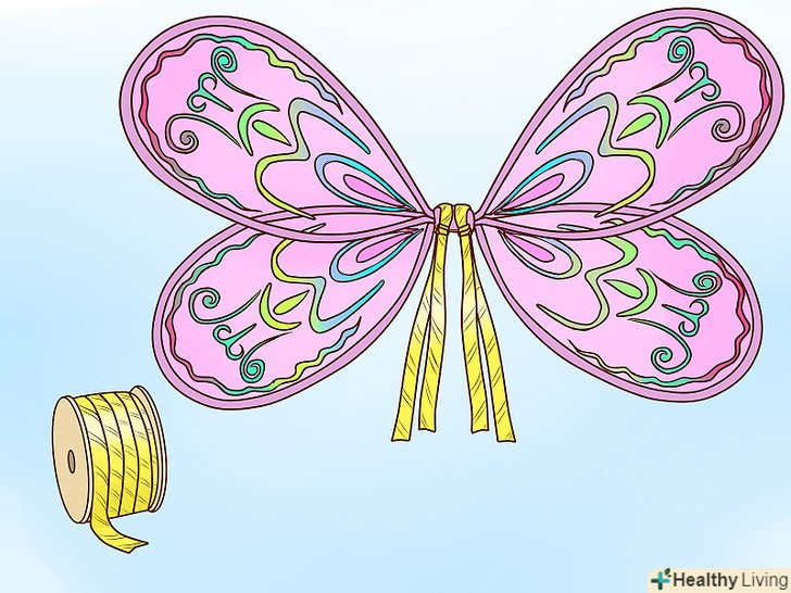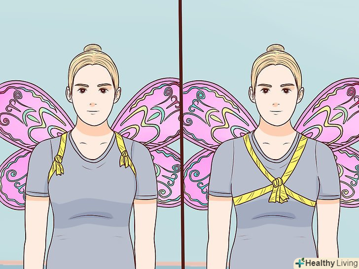 Зв'яжіть стрічки разом, щоб надіти крила на плечі.попросіть кого-небудь притиснути крила до вашої спини і зав'яжіть кінці лівої стрічки навколо свого лівого плеча. Потім зав'яжіть праву стрічку навколо правого плеча.[13]
