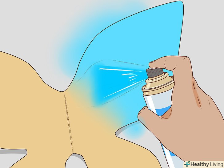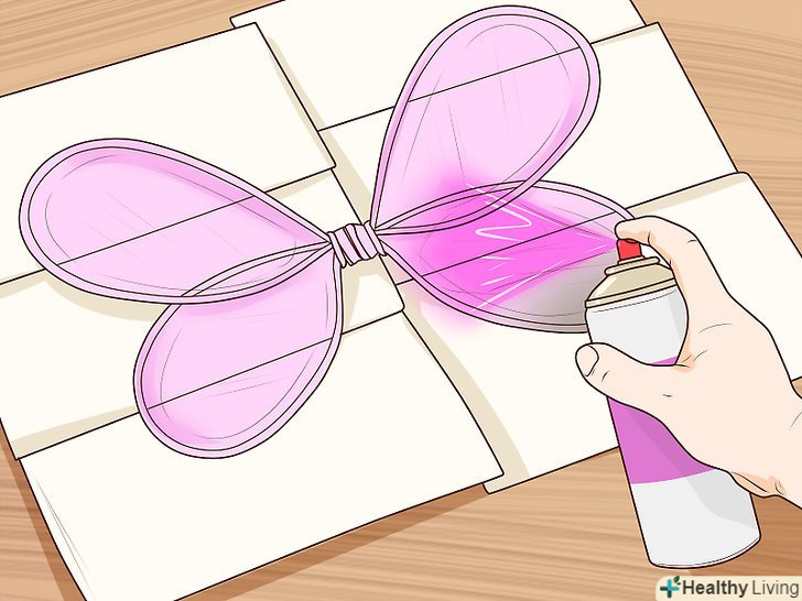 При бажанні побризкайте на Крила аерозольною фарбою.Відступіть назад або перейдіть в добре провітрюване місце. Покладіть крила на газету. Злегка побризкайте на Крила фарбою і почекайте, поки вона висохне. Потім переверніть крила на іншу сторону і при бажанні пофарбуйте і її.[6]- Можна використовувати стандартну аерозольну фарбу або фарбу для тканини.