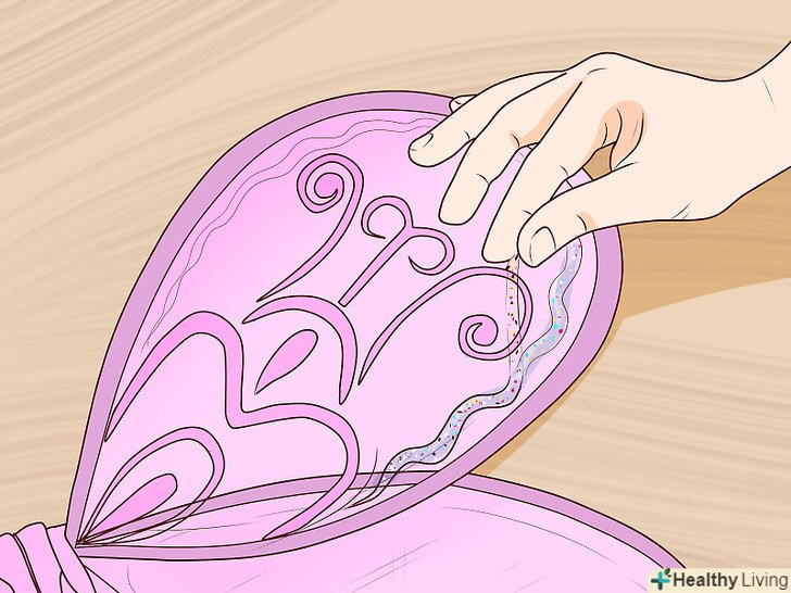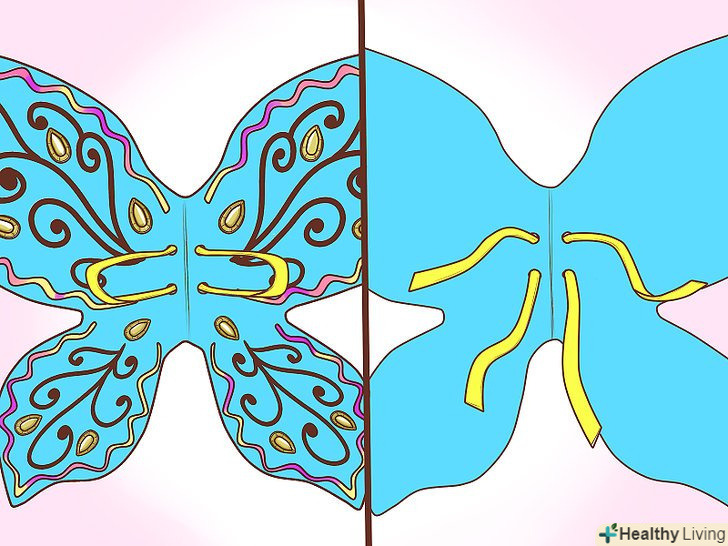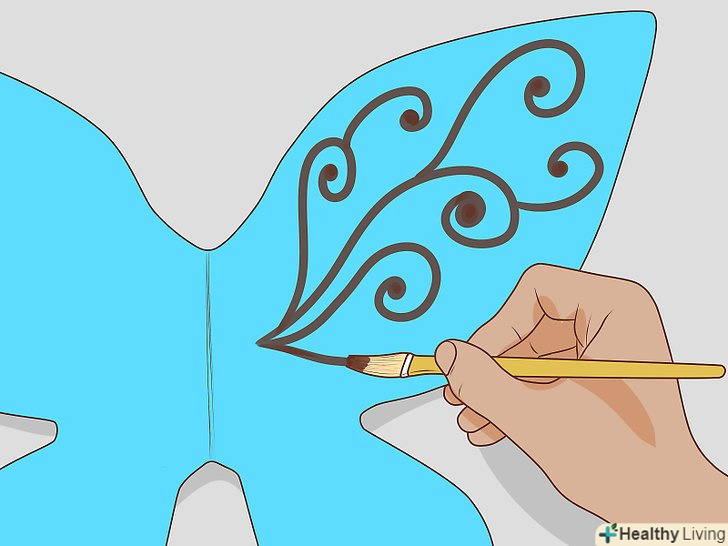 При бажанні прикрасьте крила іншими способами. Дайте волю своїй фантазії! Можна використовувати як стандартні вироби, наприклад клей з блискітками або фарбу, так і більш спеціальні засоби, такі як штучні квіти або стрази. Спробуйте наступне: [10]- Намалюйте візерунок фарбою. Поки фарба не висохла, насипте на неї трохи блискіток, щоб надати їй більш блискучий вигляд.