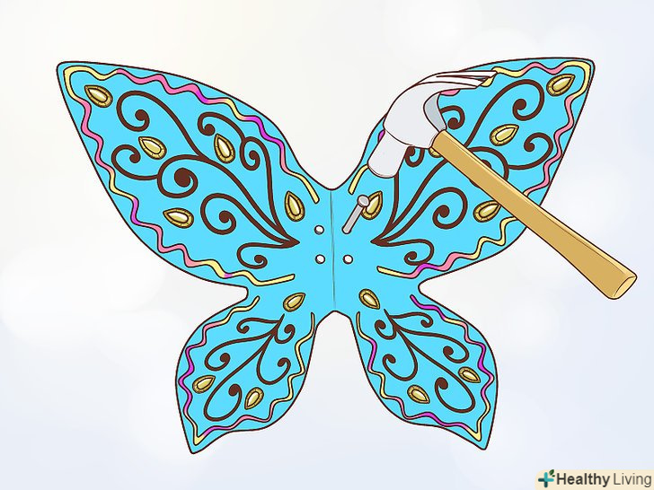 Виконайте по два отвори з обох сторін лінії згину.за допомогою молотка і цвяха пробийте 2 отвори з лівого і 2 отвори з правого боку крил. Отвори повинні розташовуватися на однаковій відстані і утворювати квадрат. Виконайте їх на відстані 5-7,5 сантиметра від центральної складки.[11]
