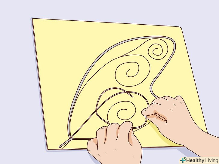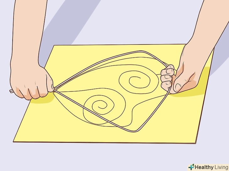 Візьміть міцний дріт і зігніть її так, щоб вона повторювала зовнішній силует крил.покладіть міцний дріт на папір з малюнком крил. Зігніть її так, щоб вона повторювала малюнок. При цьому залиште внизу крила відрізок дроту довжиною з вашу руку. Обріжте зайву дріт ножицями для дроту. При необхідності скріпіть дріт сріблястим скотчем, щоб утримати форму.[15]- Сріблястий скотч за зовнішнім виглядом нагадує металеву фольгу, хоча і виготовлений з іншого матеріалу.