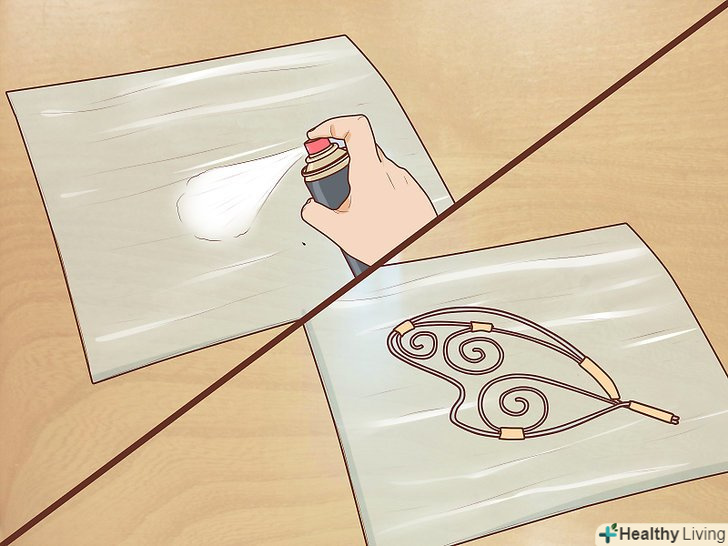 Розмотайте целофанову плівку, побризкайте на неї клеєм і покладіть на неї крило.Відмотайте досить целофану, щоб його з запасом вистачило на все крило, і як слід обприскати його аерозольним клеєм. Без зволікання покладіть на целофан крило. Поки що не обрізайте целофанову плівку.[17]- Підійде блискучий целофан, хоча можна використовувати і кольорову плівку.