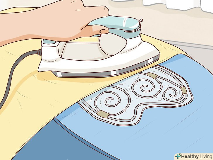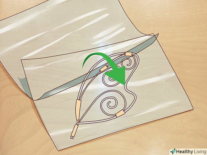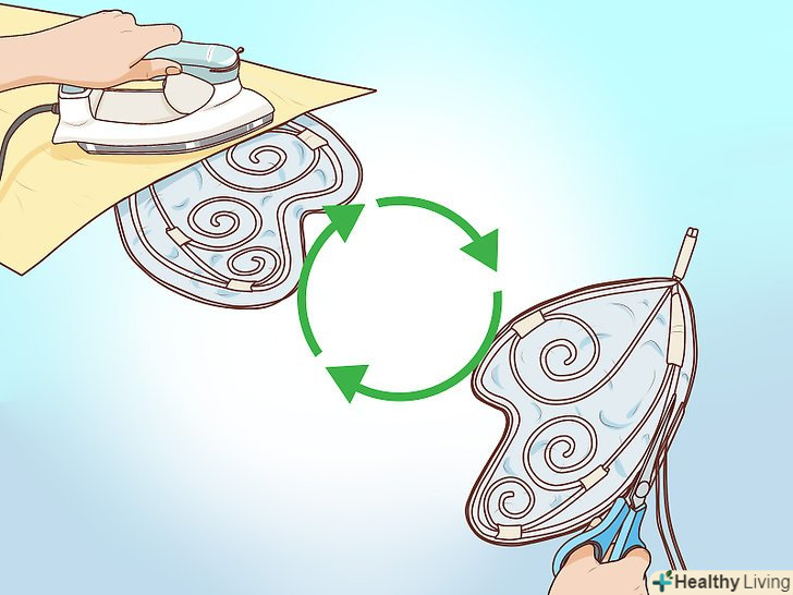 Накрийте крила папером, перш ніж прасувати їх праскою в низькотемпературному режимі.покладіть на крило канцелярський папір і на кілька секунд натисніть на нього сухою праскою (без ПАРИ). Пройдіться так уздовж всього крила, потім переверніть його і розгладьте з другої сторони. Під дією праски целофан скоротиться, зморщиться і натягнеться навколо дроту. Ні в якому разі не прикладайте праска безпосередньо до целофанової плівці і обов'язково накривайте її папером.[20]- Якщо низькотемпературний режим не дасть ніякого ефекту, трохи Підвищіть температуру.