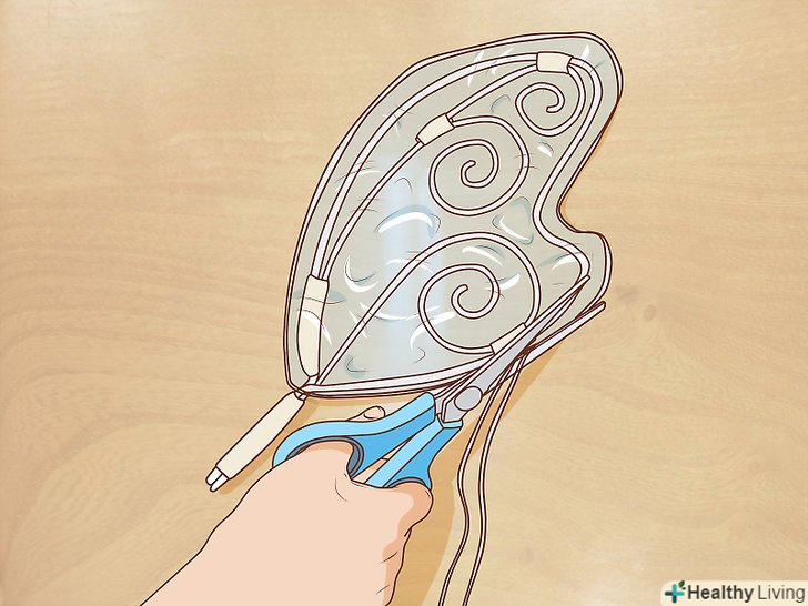 Обріжте зайву плівку, але при цьому залиште невеликий шов навколо дроту.не обрізайте целофан впритул до дроту, інакше він може відокремитися від неї. Залишайте по краях 3-7 міліметрів.[21]- Можна зрізати плівку зі стрижня внизу крил.