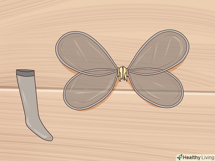 Натягніть на кожне крило доходить до коліна панчіх і закріпіть його скотчем.одягніть на кожне крило по панчосі. Натягуйте панчохи у напрямку до центру крил, так щоб тканина як слід розтягнулася. Закрутіть кінці панчіх і прикріпіть їх до дроту за допомогою скотча.[5]- Найкраще будуть виглядати білі панчохи; крім того, їх легше пофарбувати в потрібний колір. Можна використовувати і панчохи іншого кольору, наприклад чорного для костюма злої феї.