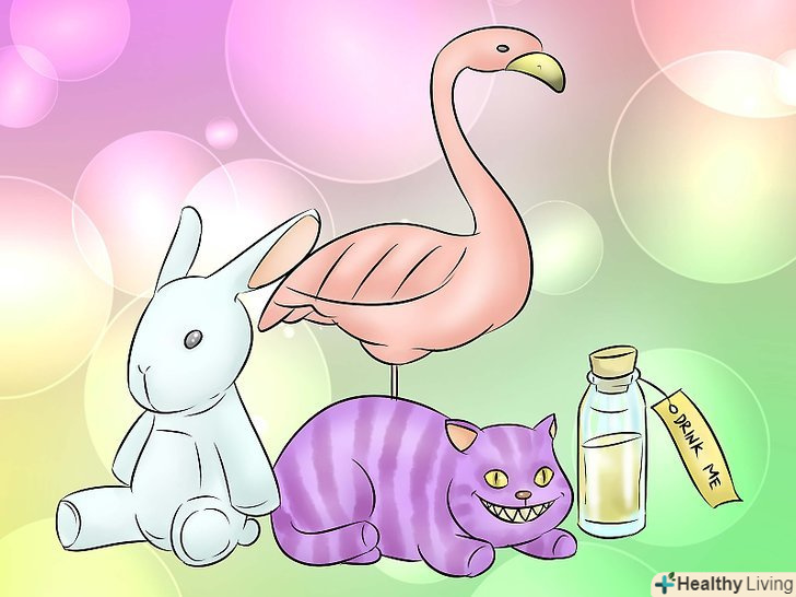 Виберіть реквізит.Подумайте про те, яка частина казки Вам подобається найбільше, і вирішите, чи хочете ви додати до костюма якийсь предмет, який буде додатково розповідати, кого ви зображуєте. Наприклад, гарною ідеєю буде м'яка іграшка-Білий кролик або смугастий кіт.- Пластиковий фламінго також може бути хорошим варіантом, якщо ви хочете відтворити сцену гри в крокет.