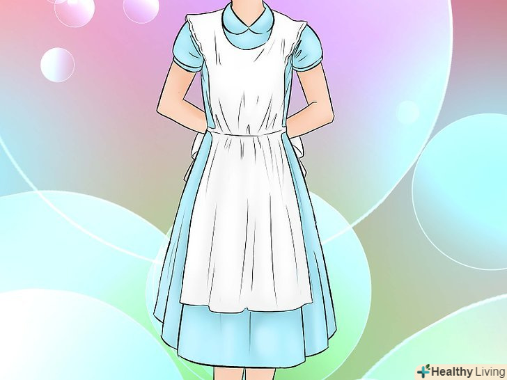 Виберіть фартух.у мультфільмі Діснея Аліса носить фартух-короткий фартух, що покриває також передню частину ліфа. В якості альтернативи можете використовувати кухонний фартух або зшити справжній фартух.[1]- Фартух Аліси білого кольору з великим бантом ззаду, який робить костюм легкоузнаваемим для оточуючих.