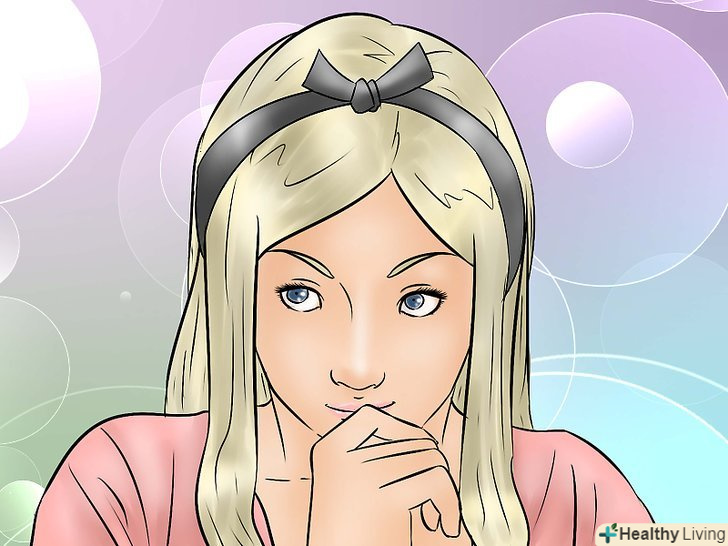 Визначтеся, чи хочете ви надіти пов'язку або ободок.в оригінальній книзі ілюстрацій Аліса не носить ободок. Тенніел додав цю деталь вже в»Задзеркаллі". Визначтеся, яку книгу ви візьмете за зразок, і додайте обруч для волосся за бажанням.[7]- Якщо ви вирішили не надягати ободок, заправте волосся за вуха і дозвольте їм вільно спадати на плечі.