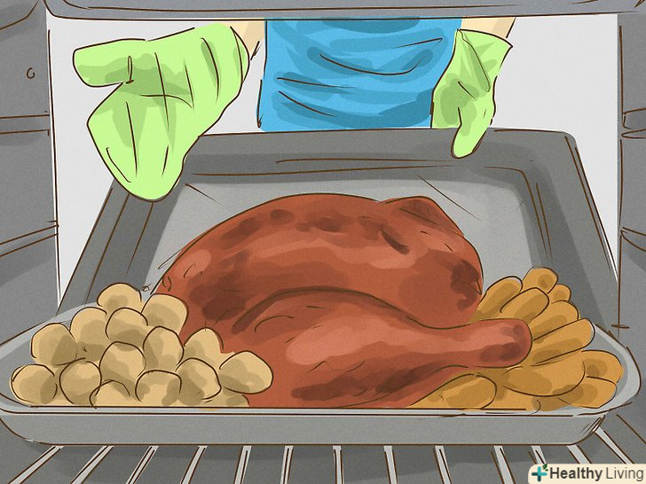 Смажте великі шматки м'яса і тверді овочі в духовці.в цьому випадку їжу готують на відкритому деку в духовці без додавання рідини. Даний метод найчастіше використовують для приготування великих шматків м'яса, наприклад цілих тушок курки або індички, нежирних шматків свинини, баранини і яловичини, філе риби. Він також хороший і для овочів.- Використовуйте відповідний деко і ставте його на середню полицю духовки. Найкраще використовувати конвекційні духовки-циркуляція гарячого повітря допомагає рівномірно підсмажити м'ясо і овочі.[9]