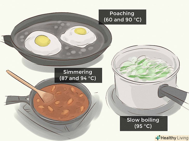 Варіть їжу в киплячій або близькій до кипіння воді.температура кипіння води залежить від атмосферного тиску і зазвичай близька до 100 °C. при варінні продукти занурюють в киплячу воду і варять до повної готовності.- Варіння в майже закипаючої воді є більш м'яким варіантом, який добре підходить для приготування таких продуктів, як риба і яйця. При цьому температура води повинна становити 60-90 °C.