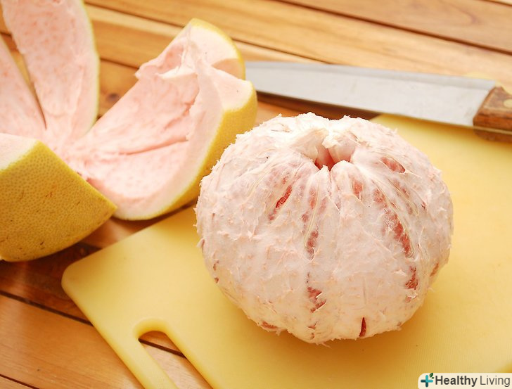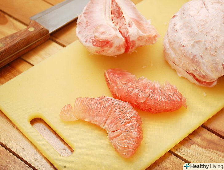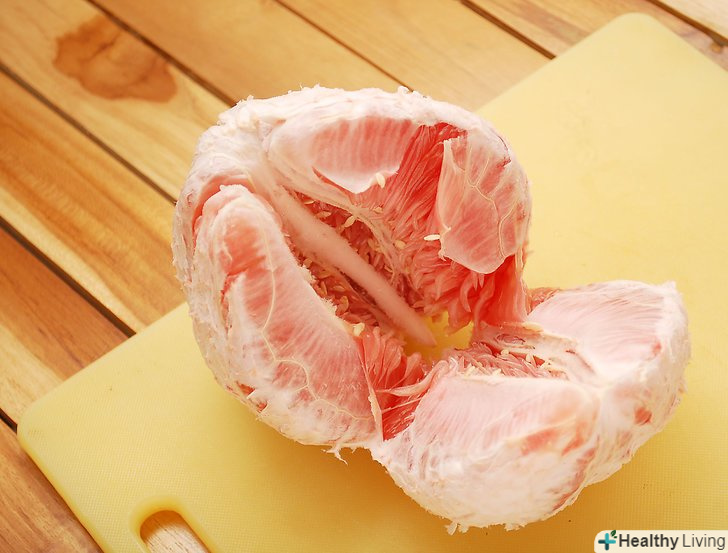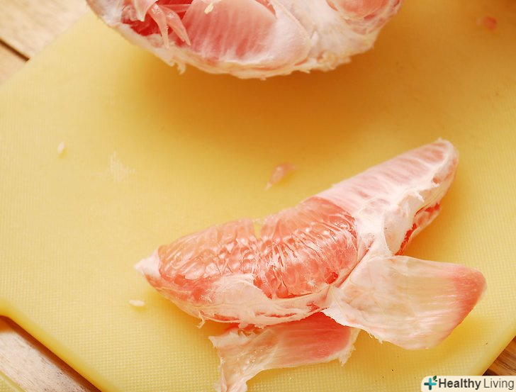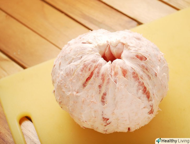Зробіть вертикальні надрізи вниз по сторонам помело.знову проріжте близько 1,5 см шкірки. Потягніть відрізані надрізи від плоду. Просуньте пальці під зріз у верхній частині (де ви відрізали верхівку) і відтягніть кожен шматок шкірки. Це відчувається майже як робота з пінополістиролом.