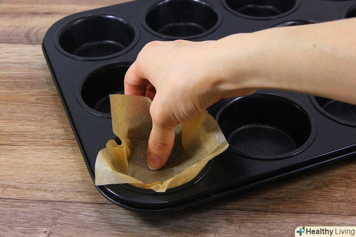 Наріжте пергаментний папір на квадрати зі стороною 13 сантиметрів, щоб помістити їх в металеві форми для випічкиМафінів і кексів.якщо ви готуєте мафіни або кекси, наріжте пергаментний папір у формі квадратів, відповідних за розміром формам для випічки. Покладіть приготовані шматочки паперу в кожну формочку, а потім акуратно втисніть папір всередину за допомогою скляного стакана відповідного розміру, щоб папір утворив акуратні складки по краях форми. Тепер можна наливати в форми тісто і випікати мафіни згідно з рецептом.[5]- Коли мафіни спечуться, покладіть на стільницю чисте лляне рушник, дістаньте форми з духовки і акуратно переверніть їх догори дном на рушник. Тепер можна акуратно зняти шматочки пергаментного паперу з дна кожного маффіна.