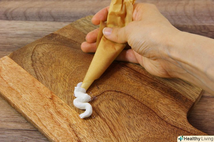 Зробіть з пергаментного паперу кондитерський мішок, щоб прикрасити випічку.візьміть шматок пергаментного паперу квадратної форми і поверніть у вигляді конуса. Заповніть конус глазур'ю, гострими ножицями відріжте кінчик конуса і прикрасьте вашу випічку візерунками![6]- Вам навряд чи вдасться створити складні, ошатні прикраси з глазурі за допомогою такого імпровізованого кондитерського мішка. Однак якщо у вас під рукою немає справжнього кондитерського мішка з насадками, Саморобний пакет з пергаментного паперу врятує становище — він допоможе вам нанести глазур і прикрасити торт або печиво.