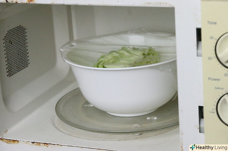 Помістіть капусту в блюдо для мікрохвильової печі.викладіть частини капусти таким чином, щоб корінець торкався дна.- Якщо ви готуєте нашатковану капусту, розподіліть її рівномірно по всьому дну. Капуста не повинна щільно прилягати і бути утрамбована, так вона гірше приготується.