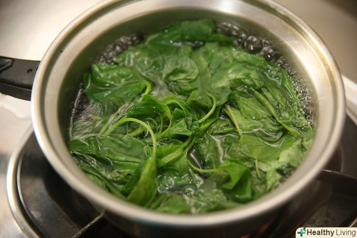 Покладіть листя шпинату в киплячу воду і варіть 30-60 секунд, поки вони не стануть яскраво-зеленого кольору.