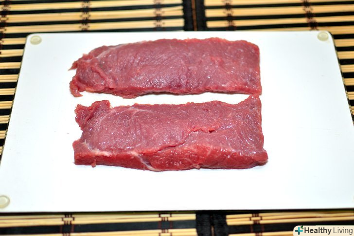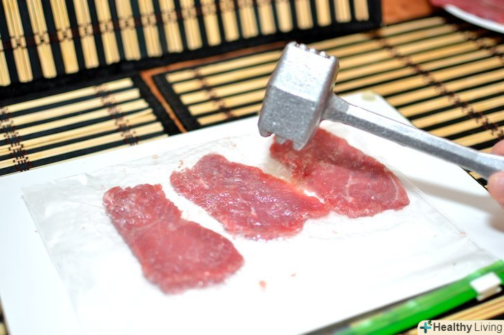 Для приготування деяких страв, в тому числі з курки або телятини, необхідно використовувати виключно тонкі шматочки м'яса. Візьміть шматки м'якоті, а потім відбийте їх до необхідного розміру з використанням м'ясного молотка.