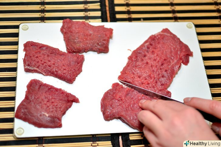 - Для досягнення професійних результатів шматочки м'яса повинні бути однакових розмірів. Відбийте кожен шматок до необхідної товщини і розріжте кожен шматок до необхідної довжини і ширини.
