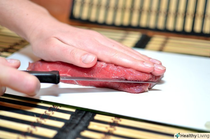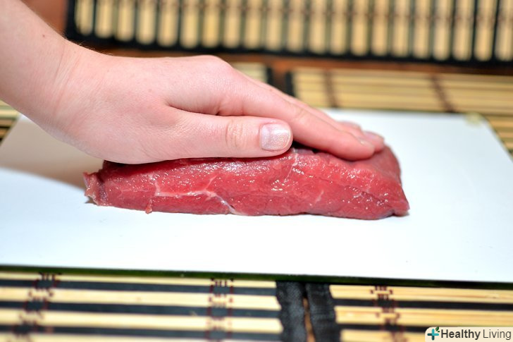 Помістіть невеликий шматок м'яса горизонтально поперек обробної дошки так, щоб довжина м'яса була паралельна краю робочої поверхні.