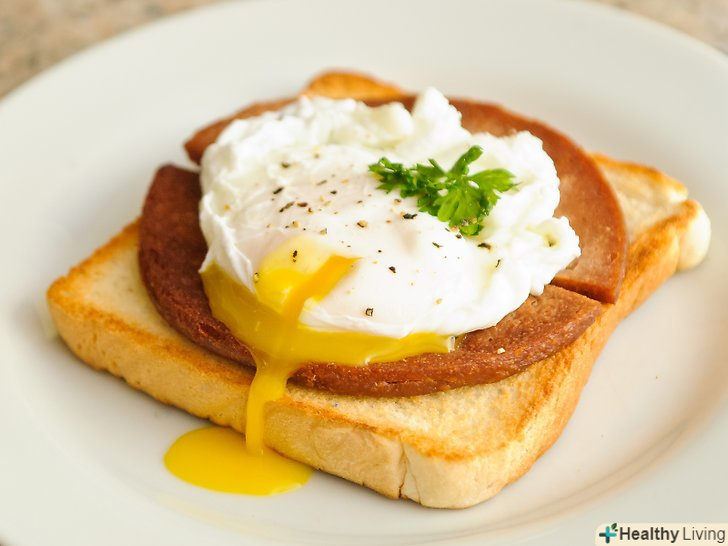 Приготуйте яйця-пашот .яйця-пашот-це ще одне корисне блюдо з яєць. Просто розбийте яйце в каструлю з водою і дайте йому поваритися від 3 до 5 хвилин. Можна додати в киплячу воду 1-2 столових ложки оцту (15-30 мл) – це допоможе білку швидше згорнутися.[4]- Щоб уникнути сальмонели, вибирайте тільки свіжі яйця. Щоб перевірити свіжість яйця, покладіть його в миску з водою. Якщо яйце свіже, то воно потоне. Чим старше яйце, тим сильніше воно спливе.