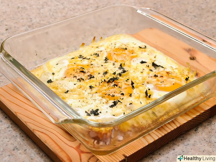 Запечіть яйця.якщо ви хочете обмежити споживання масла при приготуванні яєць, то можете запекти яйця. Просто розбийте яйця на змащену сковороду або блюдо, додайте здорові добавки на свій смак і запікайте в духовці від 10 до 15 хвилин при температурі 165ºc. Завдяки цьому способу приготування ви зможете зменшити кількість шкідливих жирів.[6]- Якщо ви не хочете використовувати масло взагалі, то візьміть сковороду з антипригарним покриттям, адже в іншому випадку вам доведеться змастити сковороду ДХІ, вершковим або рослинним маслом.