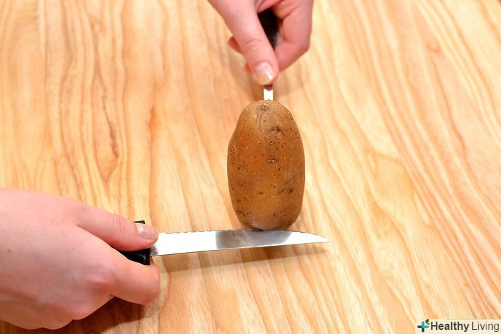 Відріжте один кінець картоплі.скибочка не повинна бути товщі, ніж 6 мм і повинна бути обрізана під кутом 90 градусів. Таким чином, це дозволить картоплі вертикально стояти на обробній дошці, не вимагаючи будь-якої стабілізації.
