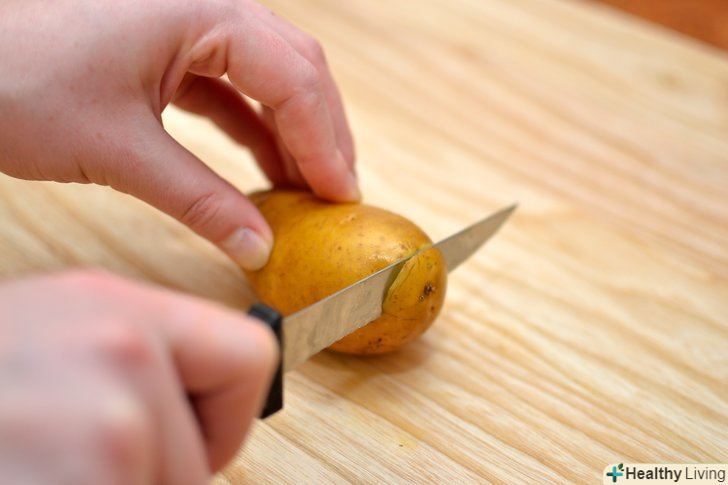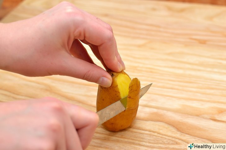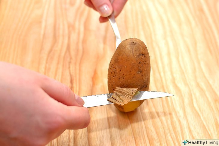 Очистіть одну сторону картоплі за допомогою гострого ножа.почніть з верхньої частини картоплі і очищайте від шкірки, поки не дійдете до низу картоплі. Намагайтеся не знімати занадто багато білої м'якоті картоплі під час очищення.