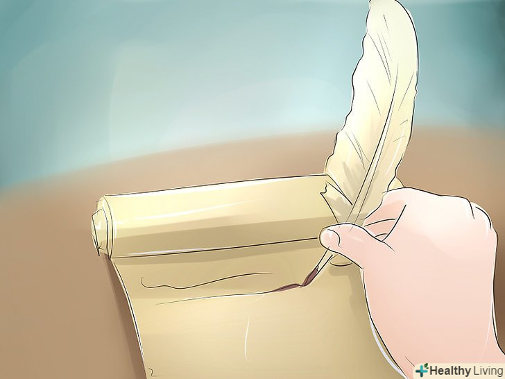 Зробіть перо для письма.перо для письма можна зробити з будь-якого пера з міцним стрижнем. Простий варіант-наклеїти перо з магазину для рукоділля на ручку або олівець. У магазинах для рукоділля можна навіть знайти штучний пергамент або сувої, щоб писати на них пером.