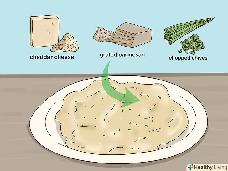Додайте сиру або трав.посипте пюре щедрою жменею тертого сиру чеддер, сиру пармезан або блакитного сиру. У пюре також можна додати нарізану шніт-цибулю або петрушку, щоб надати йому смак печеної картоплі.[13]