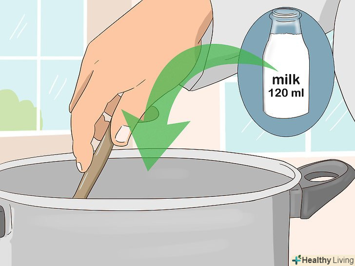 Вимкніть вогонь і додайте молоко.замість молока можна використовувати курячий або овочевий бульйон, а також воду (в тій же кількості — 120 мл).[3]
