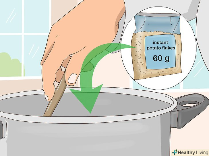 Додайте картопляне пюре швидкого приготування і почекайте півгодини.відміряйте 1 склянку (60 г) сухих картопляних пластівців і висипте їх в каструлю. Гарненько все розмішайте, щоб всі пластівці ввібрали в себе рідину. Зачекайте приблизно 30 хвилин, щоб пластівці наситилися рідиною і розбухли.[4]