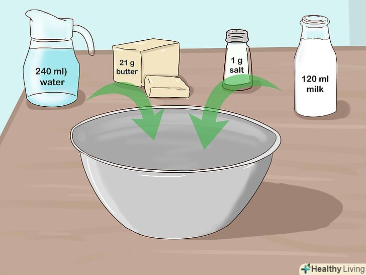 Додайте в миску потрібну кількість води, солі і молока.Візьміть придатну для мікрохвильової печі миску середніх розмірів і налийте в неї 1 стакан (240 мл) води і півсклянки (120 мл) молока. Після цього додайте ¼ чайної ложки (1 г) солі і півтори столові ложки (21 г) вершкового масла або маргарину і розмішайте.[6]- Якщо ви не хочете використовувати молоко, його можна замінити курячим або овочевим бульйоном, а також водою.