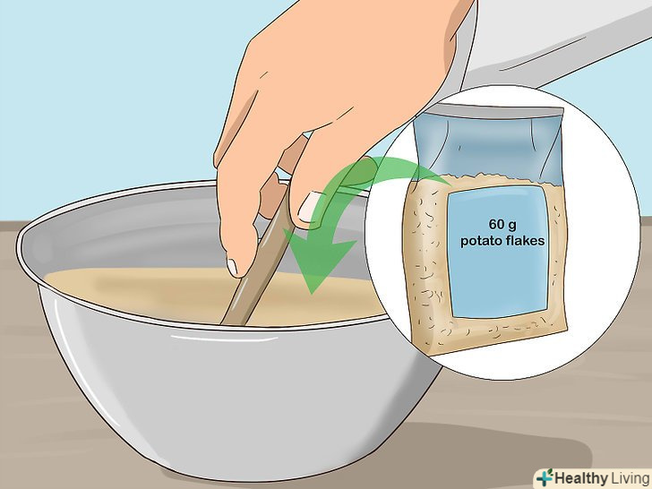 Додайте картопляні пластівці.висипте в миску 1 склянку (60 г) картопляного пюре швидкого приготування і розмішайте, щоб пластівці наситилися рідиною. Накрийте миску кришкою.[7]- Якщо у вас немає кришки, накрийте миску тарілкою відповідного розміру, яку можна використовувати в мікрохвильовій печі.