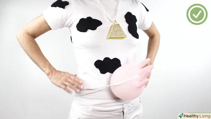 Пов'яжіть хвіст на талію поверх базового костюма.спочатку одягніть свій плямистий одяг. Потім обв'яжіть білу мотузку з мотузковим хвостом навколо талії. Спереду зав'яжіть невеликий, але надійний вузол і сховайте під одягом вільні кінці мотузки.- Прив'яжіть мотузкою вим'я спереду до талії.розташуйте вим'я з рукавички по центру живота таким чином, щоб пальці стирчали назовні. Потім обв'яжіть талію разом з вим'ям мотузкою. Зав'яжіть мотузку на вузол.