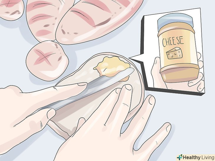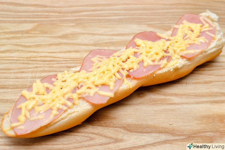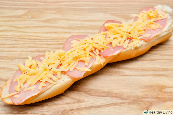 Покладіть сир поверх шару м'яса.у Сабвеї, сир ріжуть трикутниками. Якщо ви повністю копіюєте оригінал, то поріжте ваш сир на трикутники. Робите ви так чи ні, в будь-якому випадку покрийте м'ясо шаром сиру.- Якщо ви порізали сир на трикутники, то складіть з них мозаїку. Мається на увазі чергування скибочок так, щоб вони не нашаровувалися один на одного.